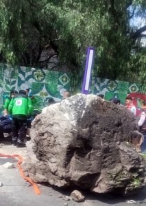 Elementos de la Dirección de Protección Civil de la alcaldía Gustavo A. Madero y de la Secretaría de Seguridad Ciudadana (SSC) atendieron de inmediato a un adulto que fue lesionado por la caída de una roca de 2.5 metros de diámetro y aproximadamente 2 toneladas de peso sobre la avenida Cantera, frente a la estación del Metrobús Hospital Infantil La Vila.