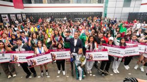 En el ágora “Elena Poniatowska”, el alcalde encabezó la entrega de apoyos económicos a 116 niñas, niños y jóvenes de alto rendimiento: 82 mayores de edad recibieron 72 mil pesos cada uno, mientras que 34 menores fueron beneficiados con 36 mil pesos, recursos destinados a cubrir transporte, materiales de entrenamiento y alimentación.